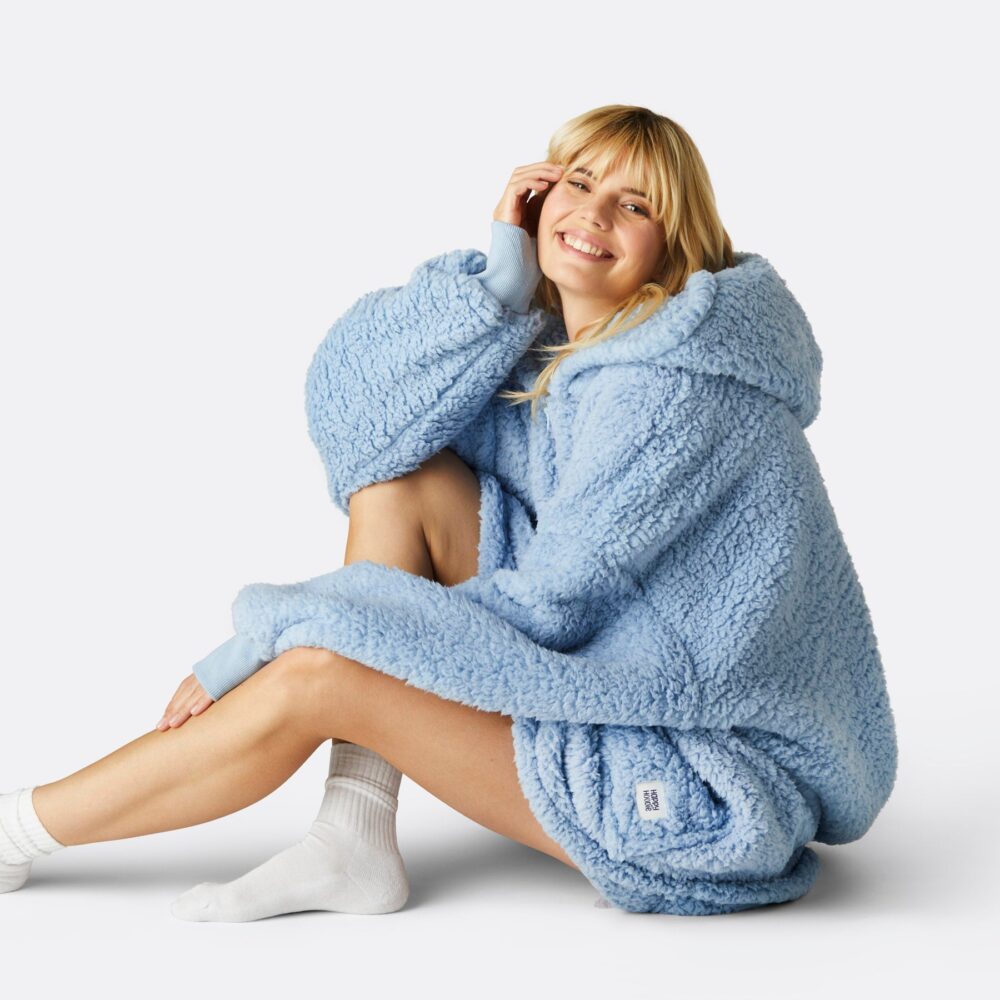 Denne Blå HappyHoodie minder mest af alt om et hyggetæppe med ærmer og hætte. Pasformen er supersized, så det er altså en trøje alle kan passe. Den store pasform gør også at det er nemmere at putte sig godt til rette foran fjernsynet på ekstra kolde aftner.